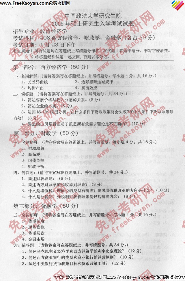 中国政法大学2005年考研真题-西方经济学、财政学、金融学