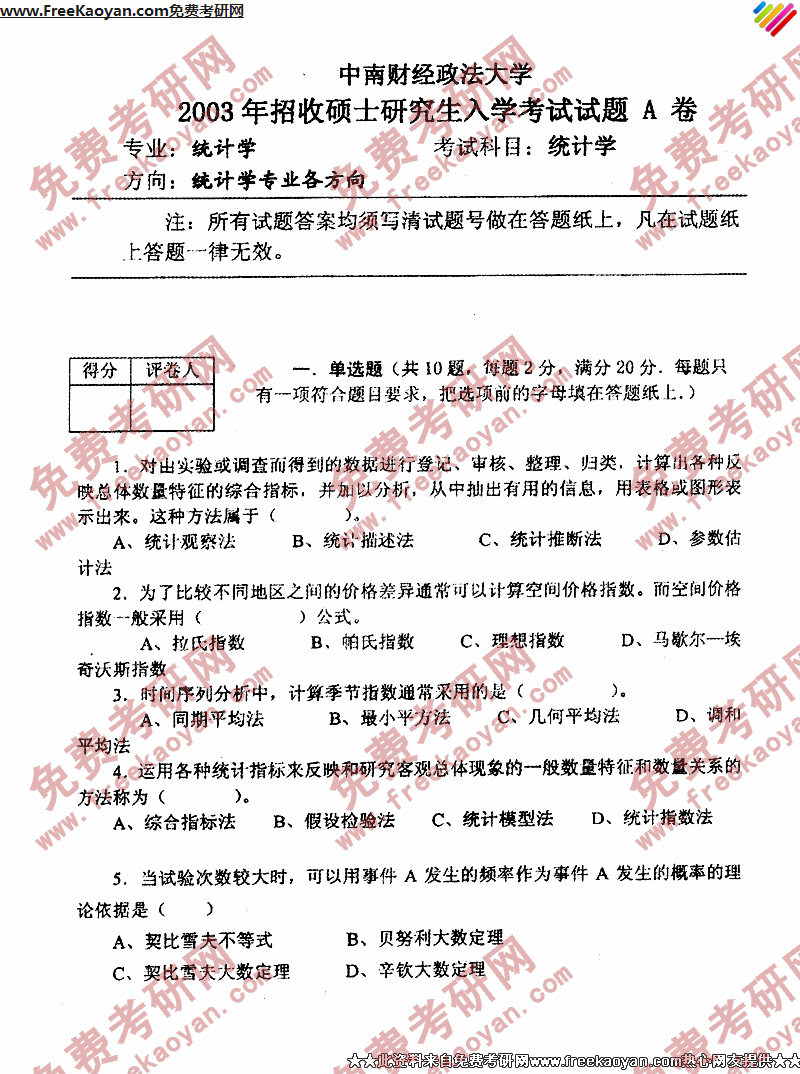中南财经政法大学2003年考研真题-统计学