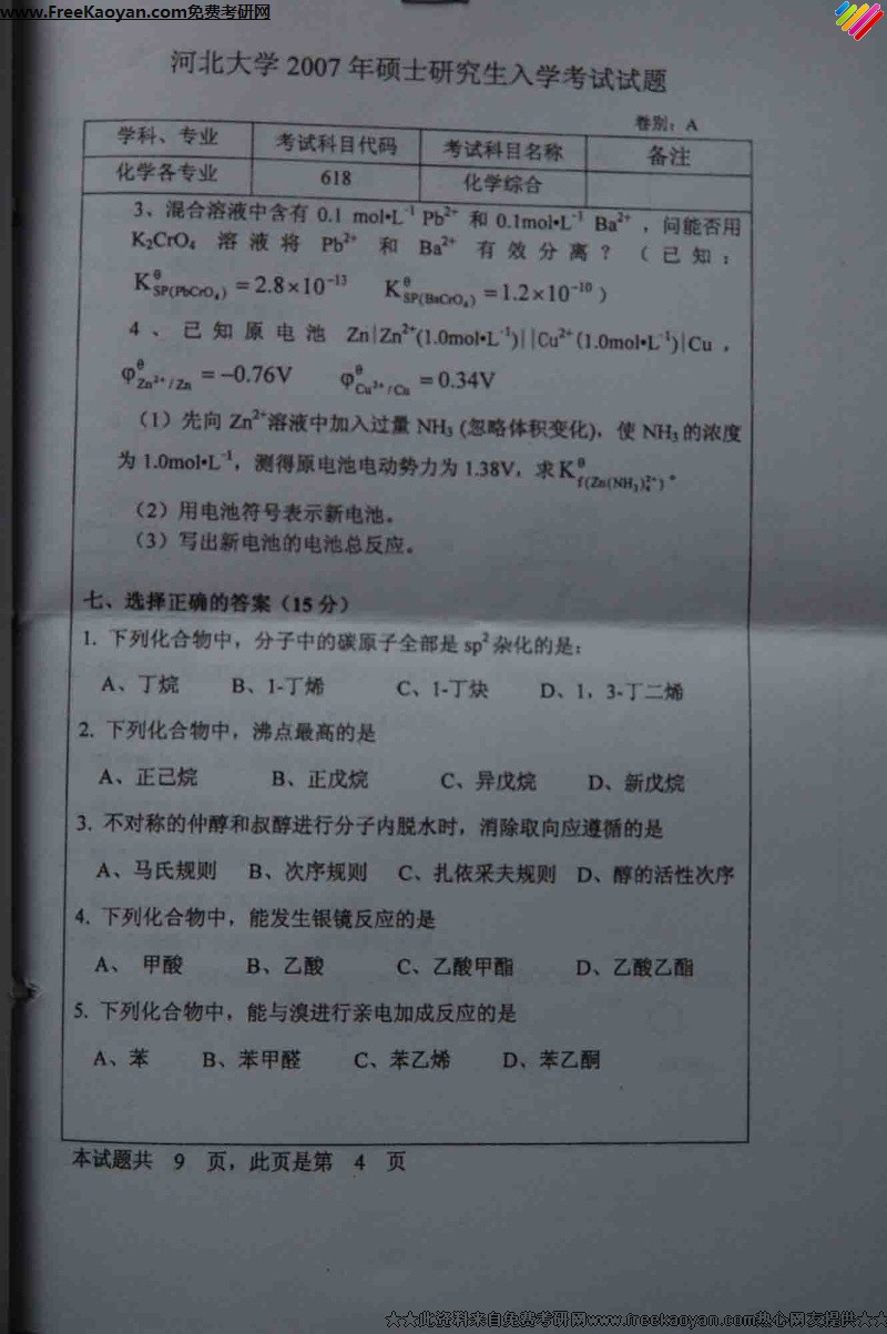 河北大学2007年考研真题-化学综合(4)