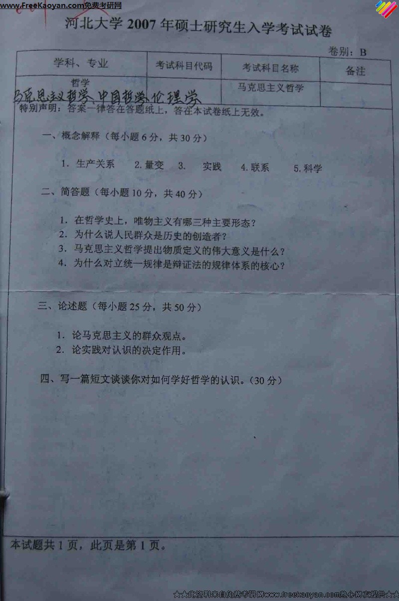 专业课考研经验 本站小编 FreeKaoyan 2018-01-23河北大学2007年考研真题-马克思主义发展史