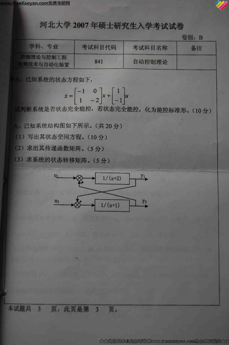河北大学2007年考研真题-自动控制理论(3)
