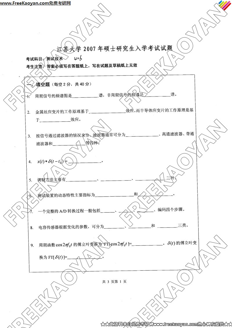 江苏大学2007年考研真题-测试技术