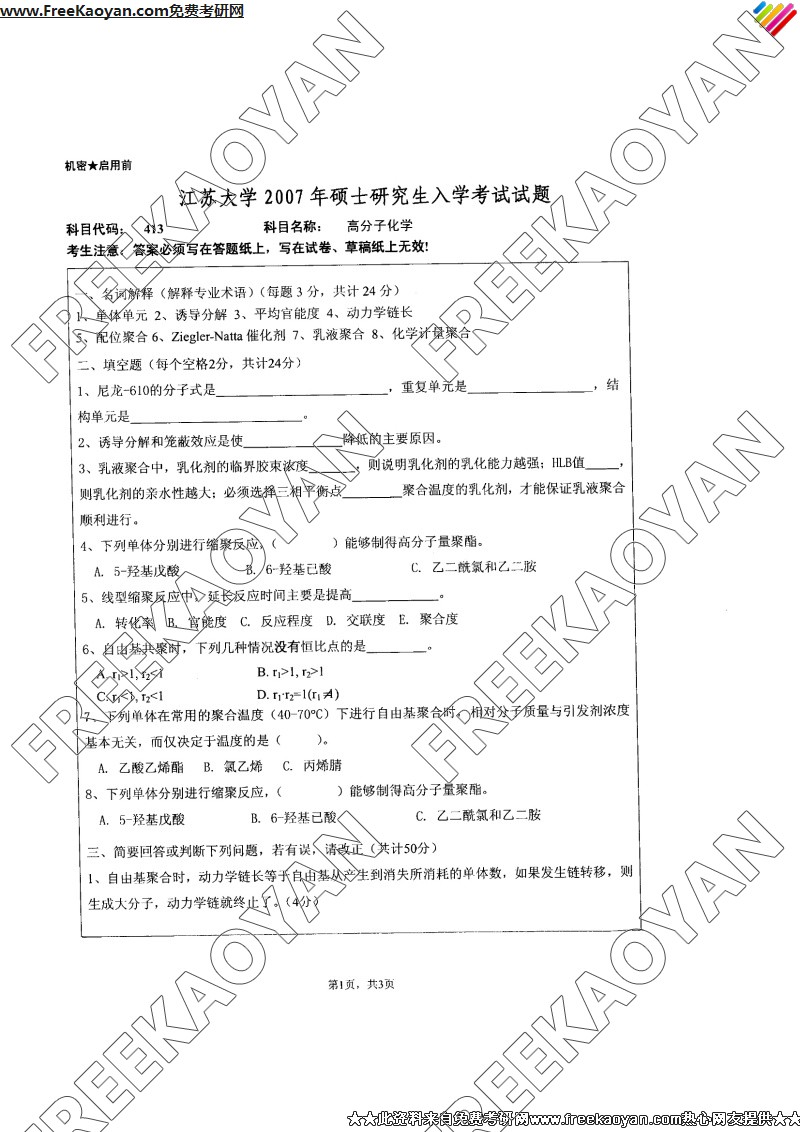 江苏大学2007年考研真题-高分子化学