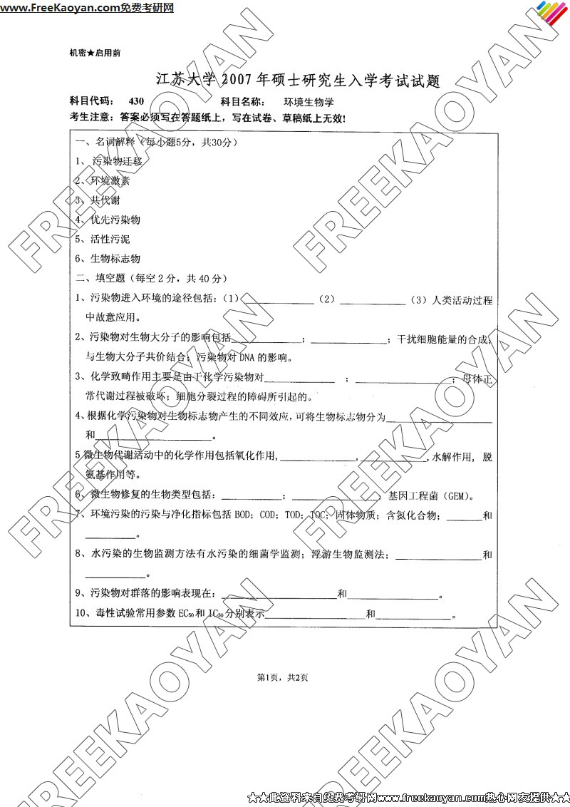 江苏大学2007年考研真题-环境生物学