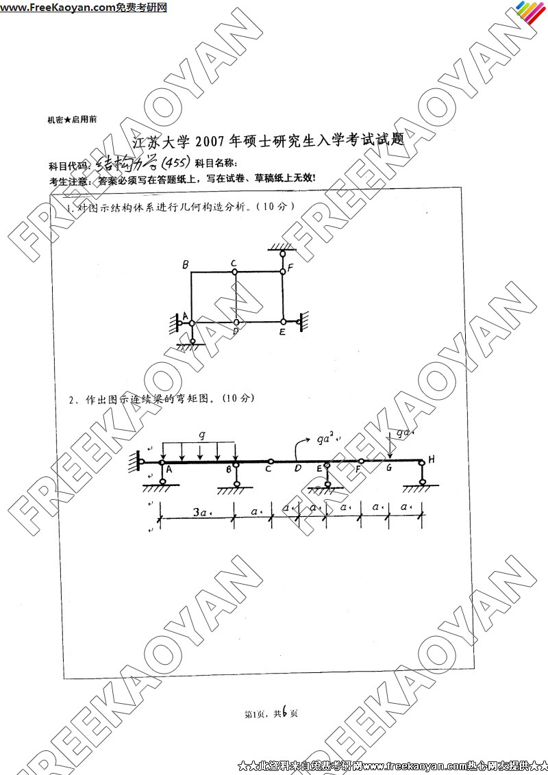 专业课考研经验 本站小编 FreeKaoyan 2018-01-23江苏大学2007年考研真题-工程力学