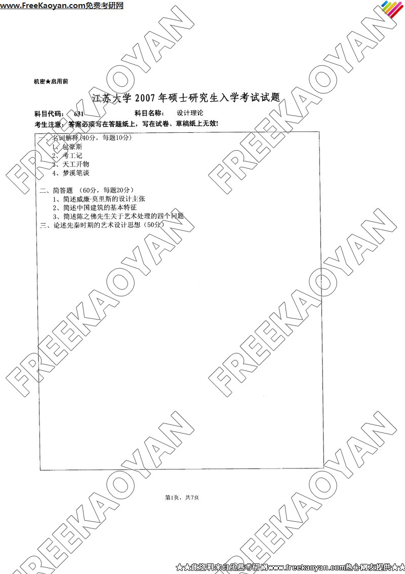 专业课考研经验 本站小编 FreeKaoyan 2018-01-23江苏大学2007年考研真题-设计基础