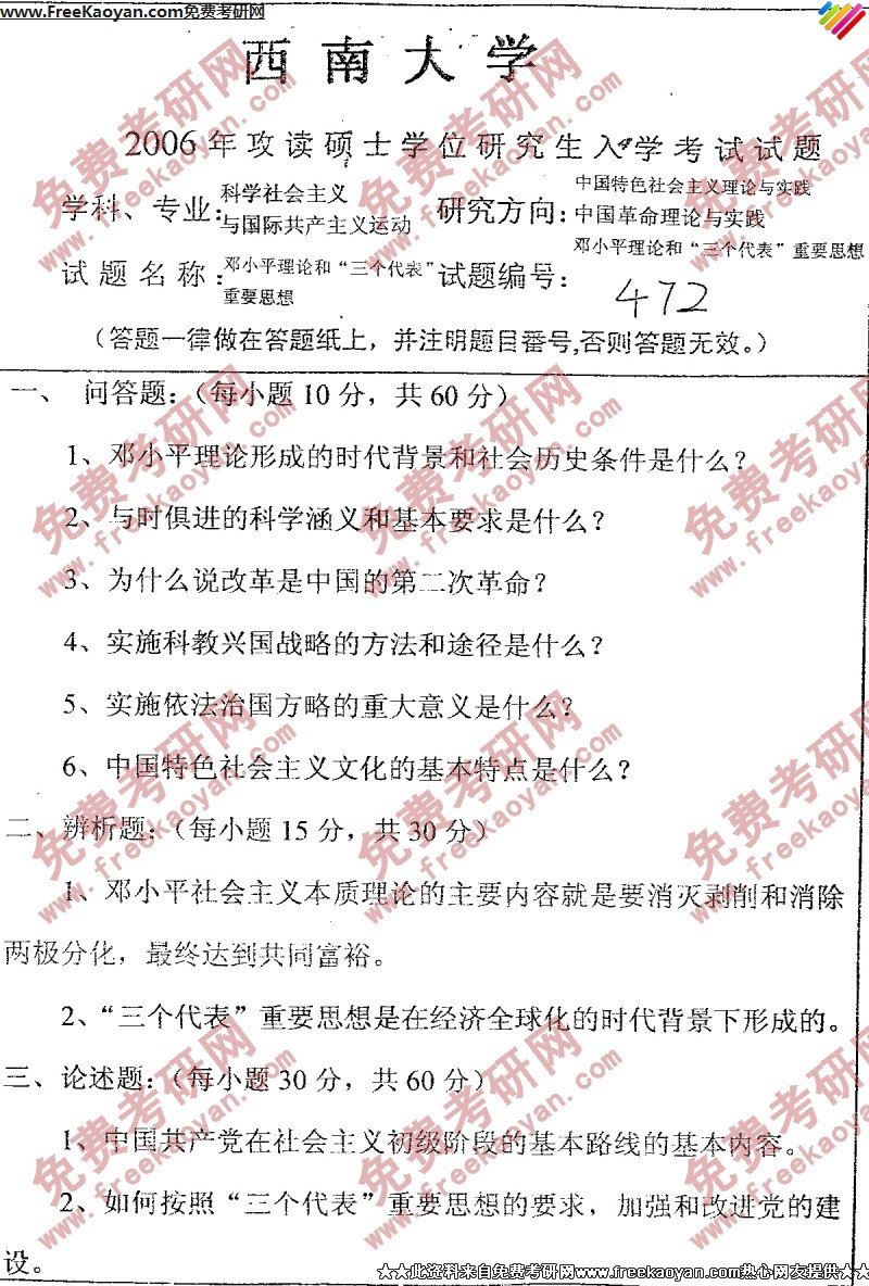 西南大学2006年考研真题-邓小平理论和三个代表重要思想