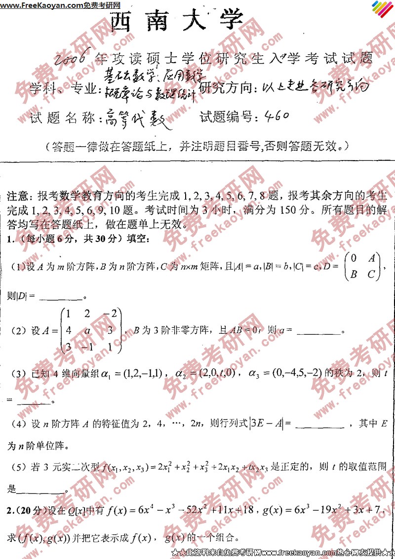 专业课考研经验 本站小编 FreeKaoyan 2018-01-23西南大学2006年考研真题-地质学