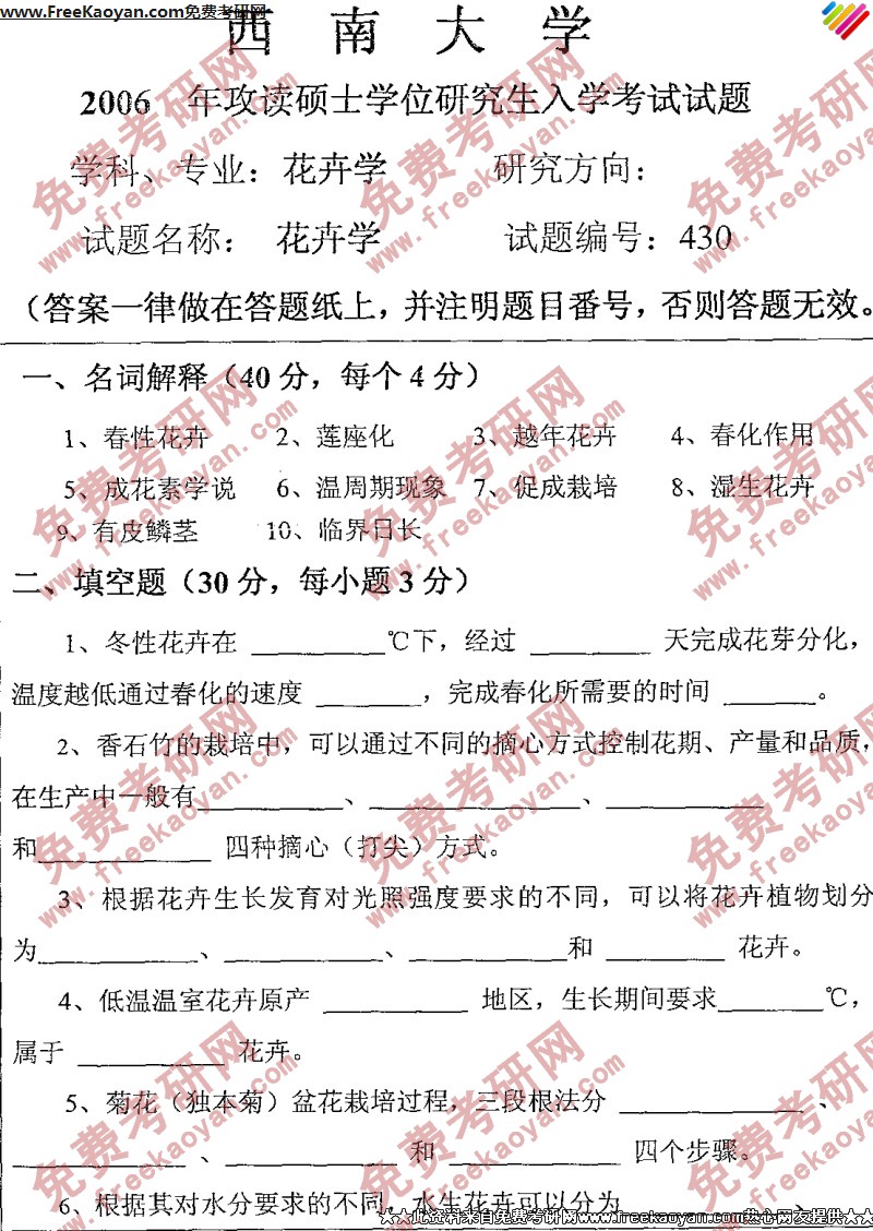 专业课考研经验 本站小编 FreeKaoyan 2018-01-23西南大学2006年考研真题-分析化学