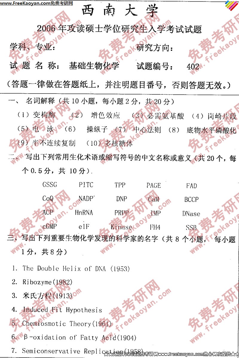 专业课考研经验 本站小编 FreeKaoyan 2018-01-23西南大学2006年考研真题-分析化学
