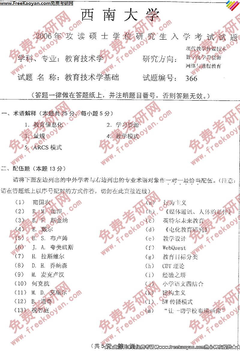 专业课考研经验 本站小编 FreeKaoyan 2018-01-23西南大学2006年考研真题-教学论1