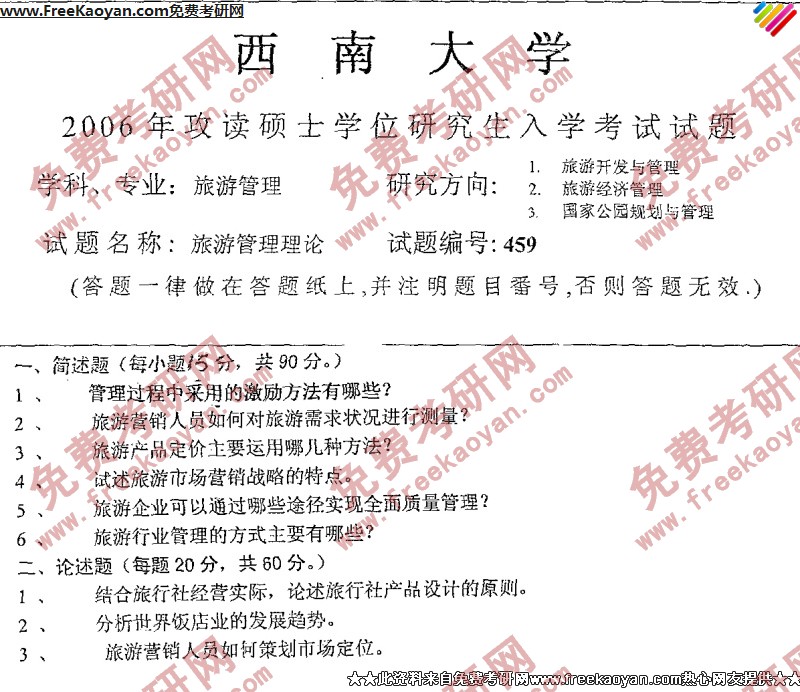 西南大学2006年考研真题-旅游管理理论