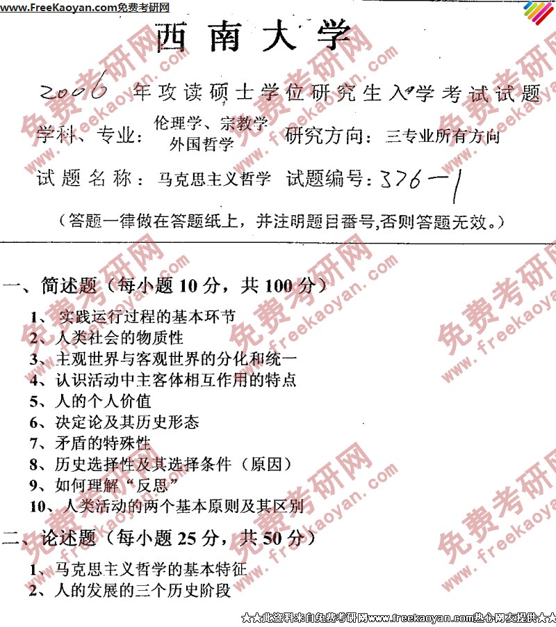 专业课考研经验 本站小编 FreeKaoyan 2018-01-23西南大学2006年考研真题-理论综合试题