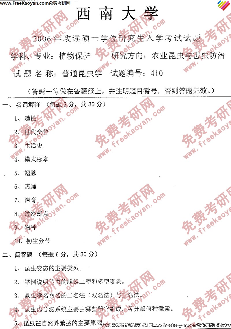 专业课考研经验 本站小编 FreeKaoyan 2018-01-23西南大学2006年考研真题-理论综合试题