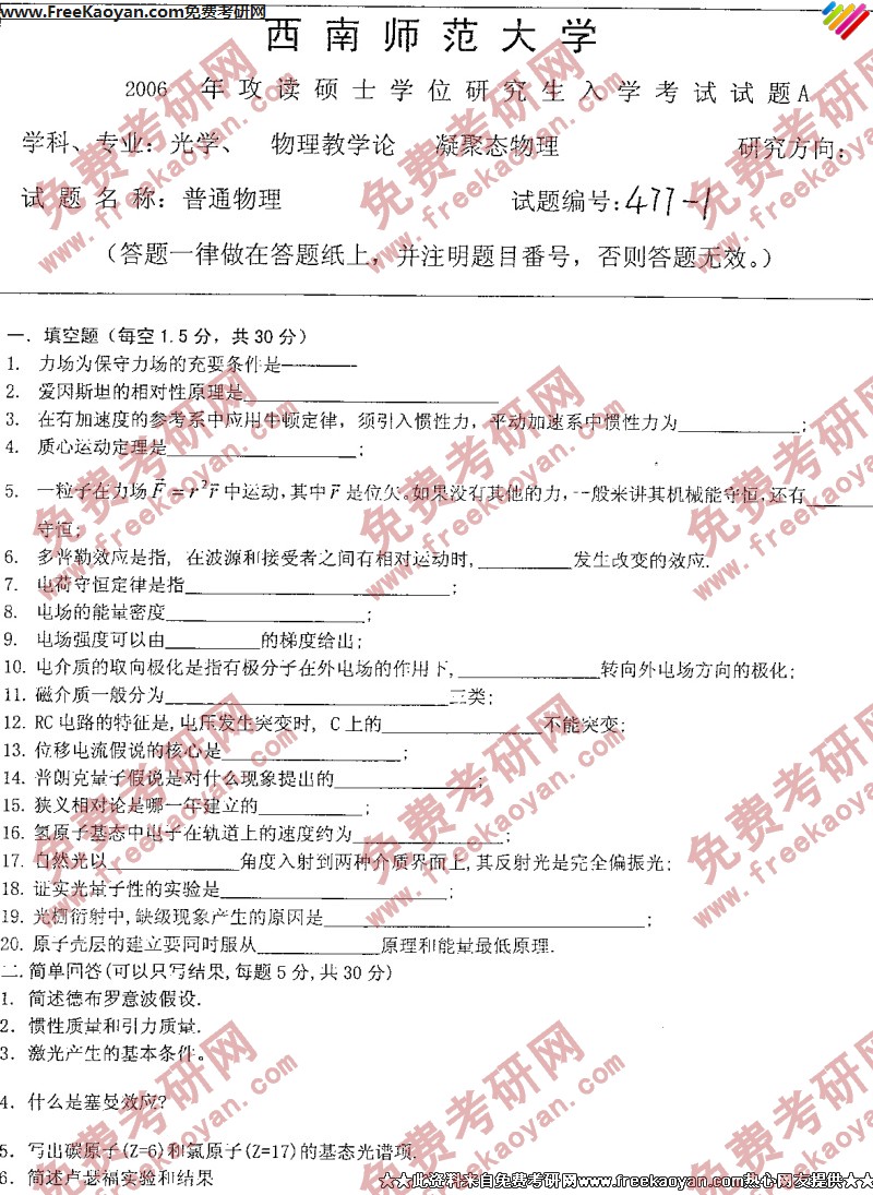 西南大学2006年考研真题-普通物理