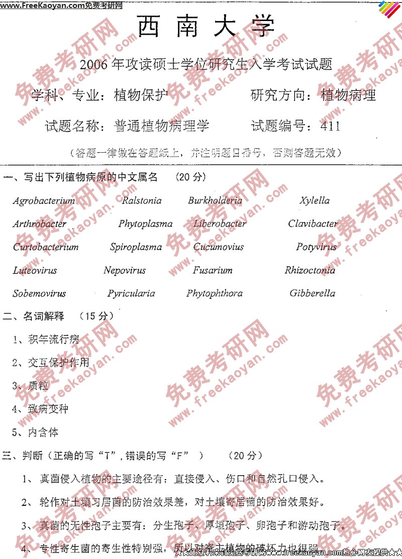 西南大学2006年考研真题-普通植物病理学