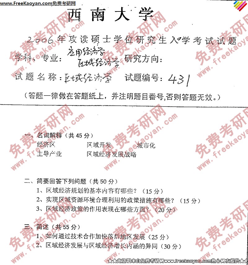 专业课考研经验 本站小编 FreeKaoyan 2018-01-23西南大学2006年考研真题-理论综合试题
