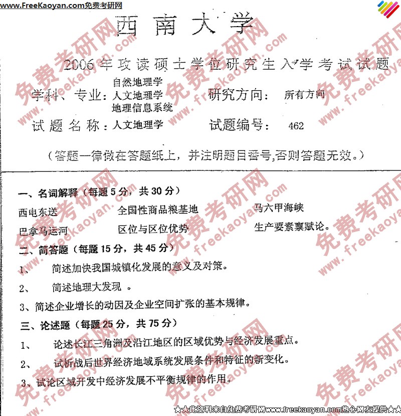 专业课考研经验 本站小编 FreeKaoyan 2018-01-23西南大学2006年考研真题-理论综合试题