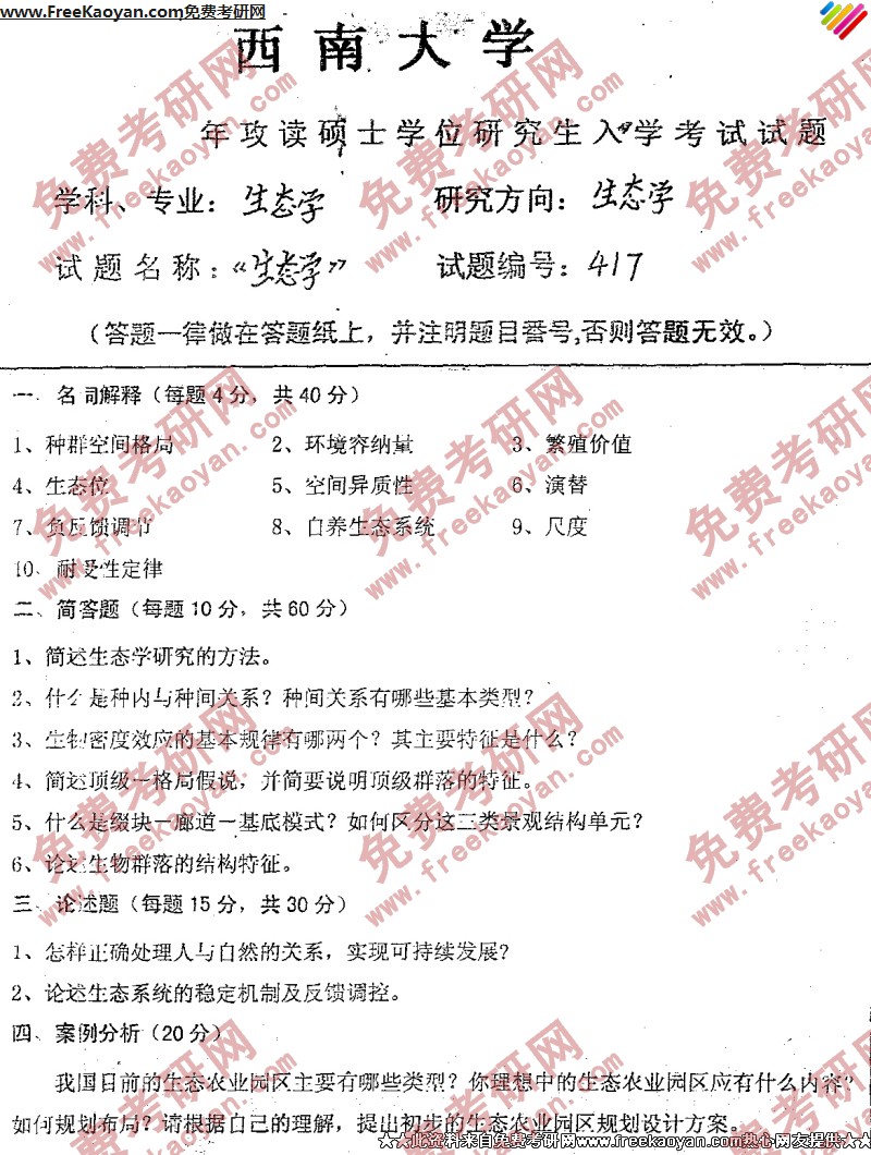 专业课考研经验 本站小编 FreeKaoyan 2018-01-23西南大学2006年考研真题-森林生态学
