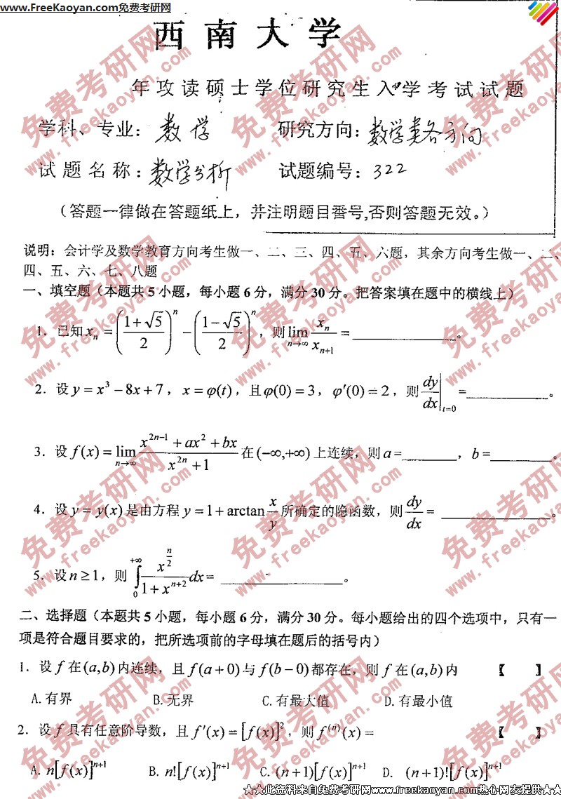 西南大学2006年考研真题-数学分析
