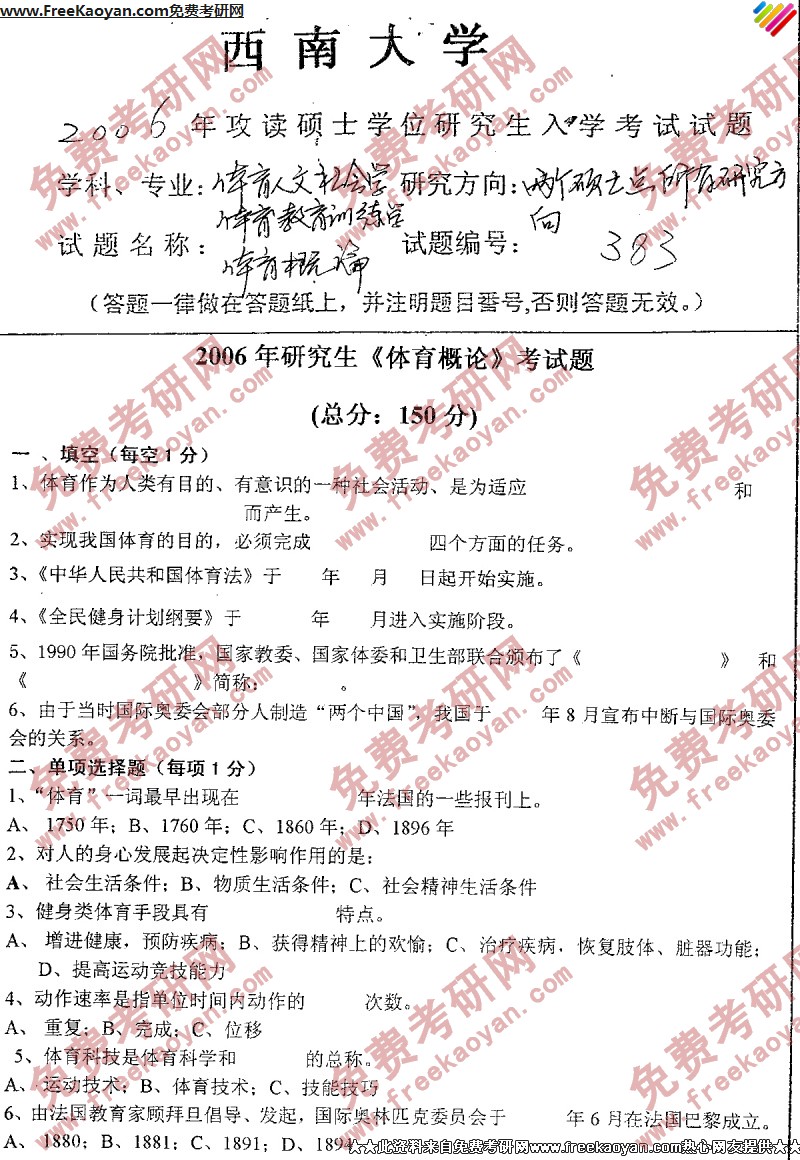相关话题/考研真题 体育 西南大学 概论