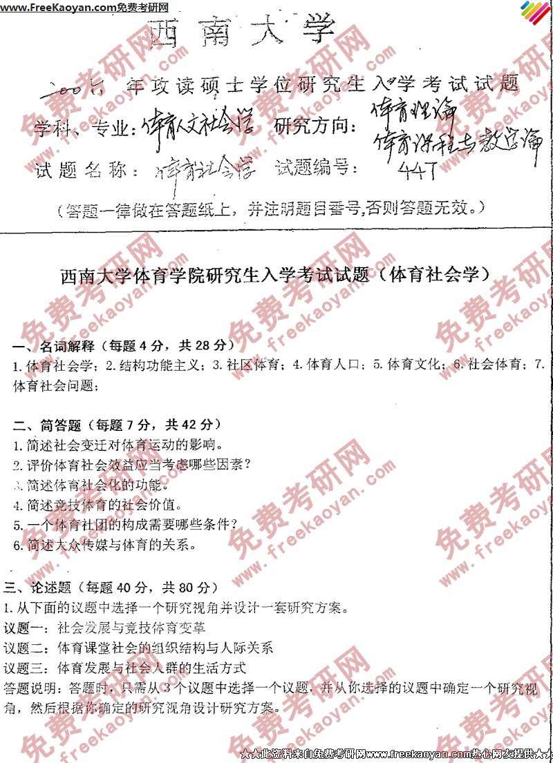 专业课考研经验 本站小编 FreeKaoyan 2018-01-23西南大学2006年考研真题-社会学
