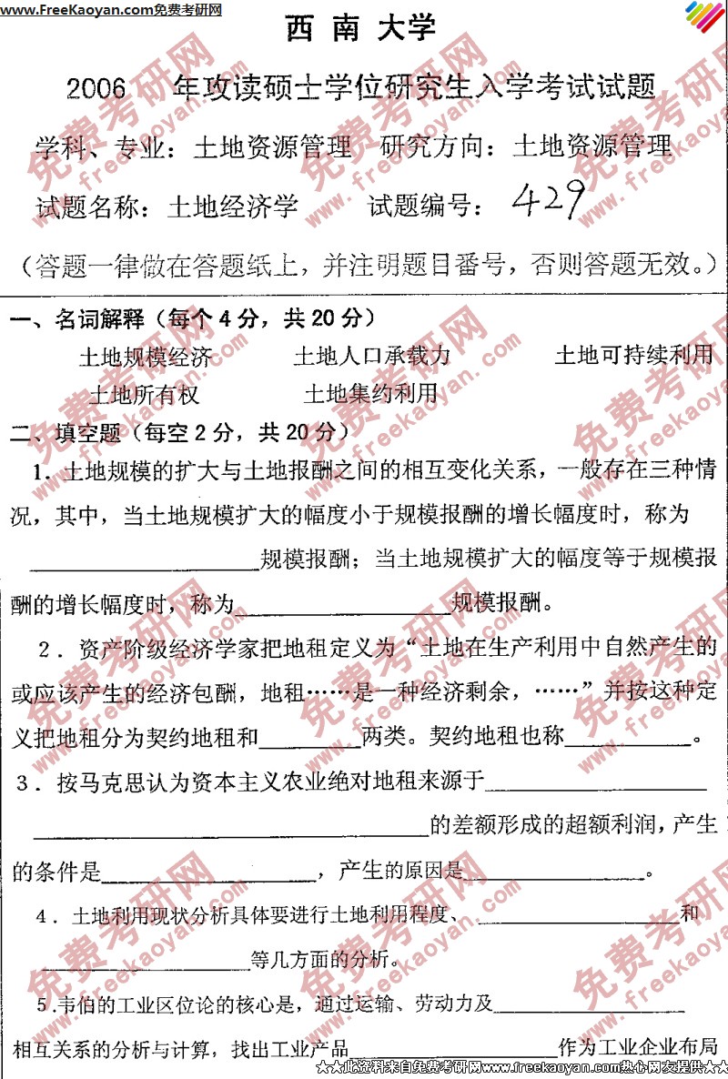 专业课考研经验 本站小编 FreeKaoyan 2018-01-23西南大学2006年考研真题-土地管理学