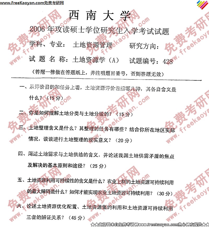 专业课考研经验 本站小编 FreeKaoyan 2018-01-23西南大学2006年考研真题-土地管理学