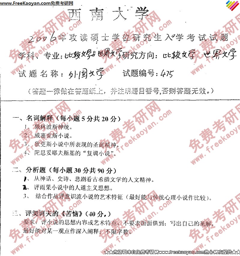 专业课考研经验 本站小编 FreeKaoyan 2018-01-23西南大学2006年考研真题-世界史
