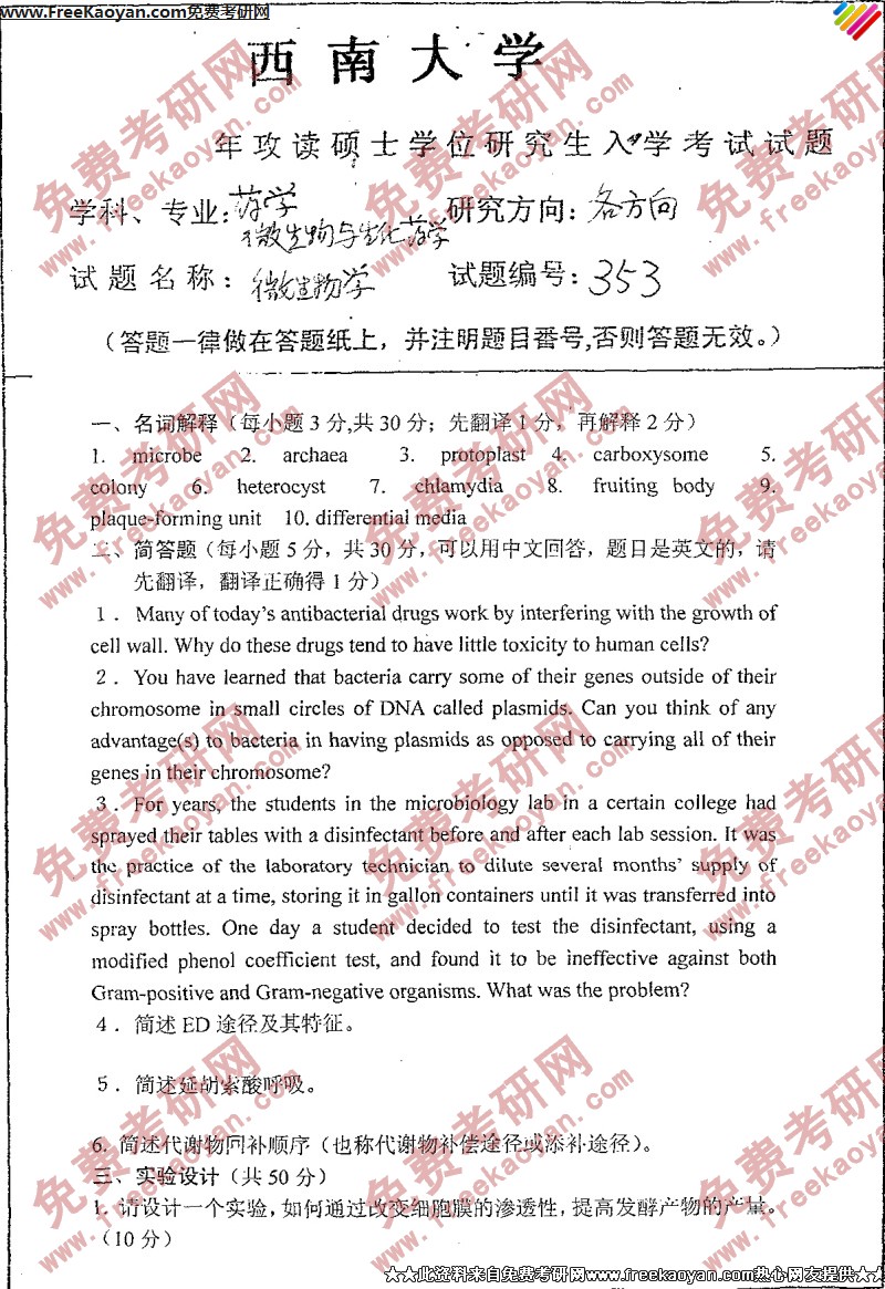相关话题/西南大学 考研真题 微生物学