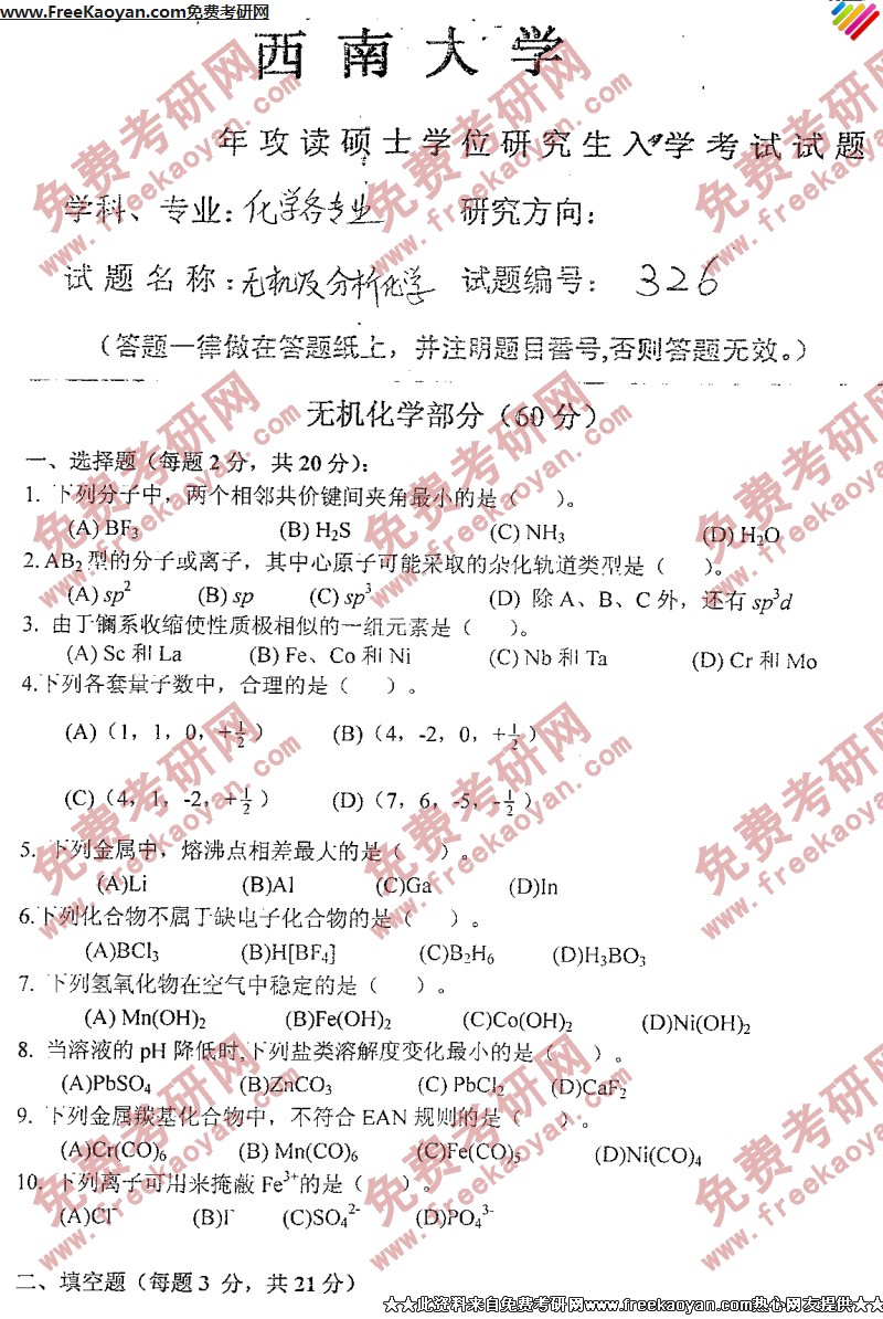 西南大学2006年考研真题-无机及分析化学