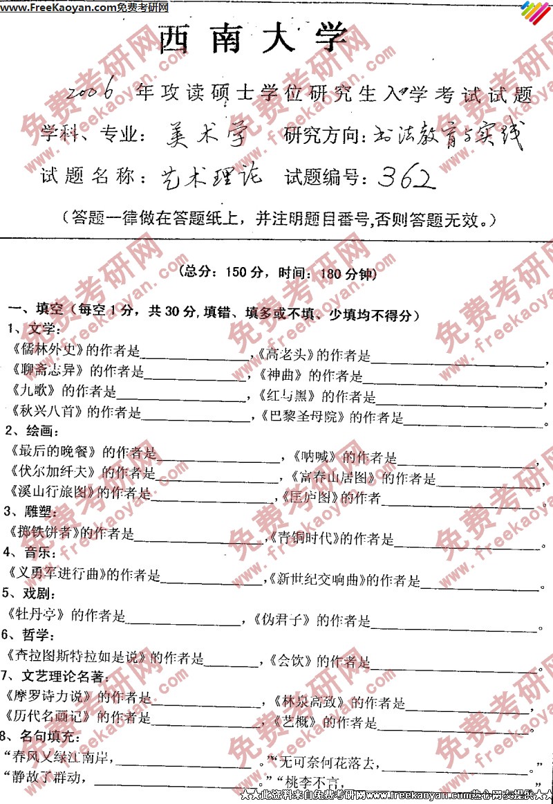 相关话题/考研真题 艺术 西南大学 理论