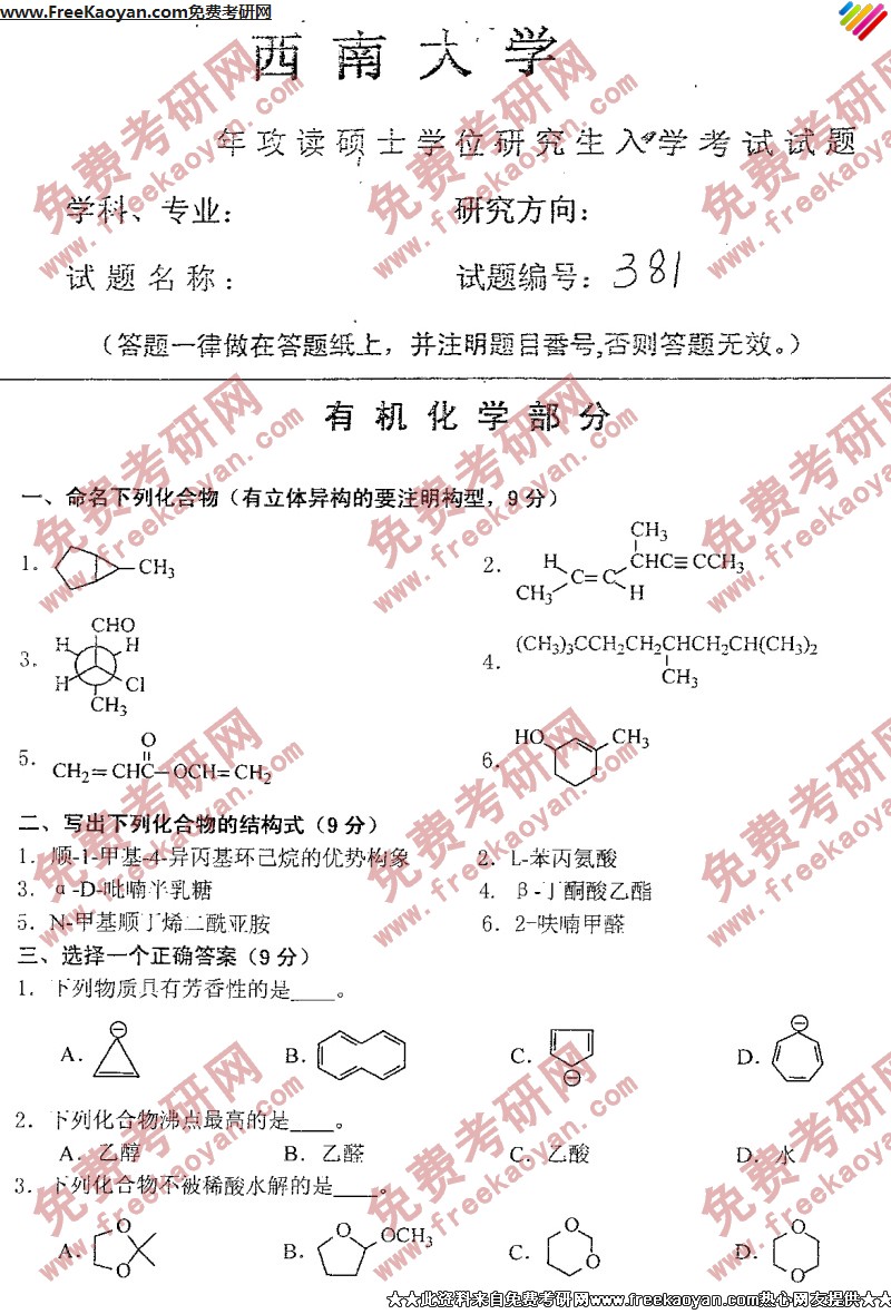 专业课考研经验 本站小编 FreeKaoyan 2018-01-23西南大学2006年考研真题-无机及分析化学