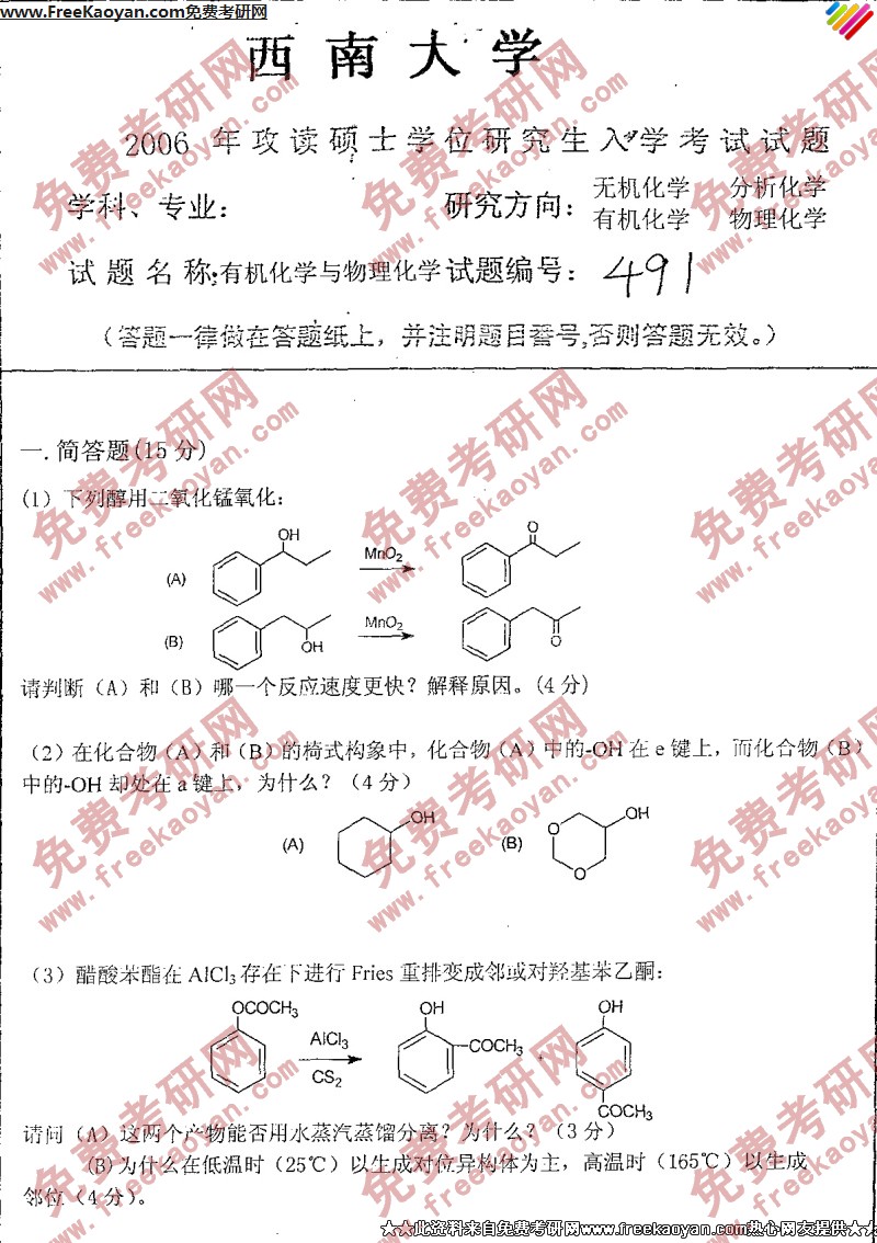 专业课考研经验 本站小编 FreeKaoyan 2018-01-23西南大学2006年考研真题-有机化学406