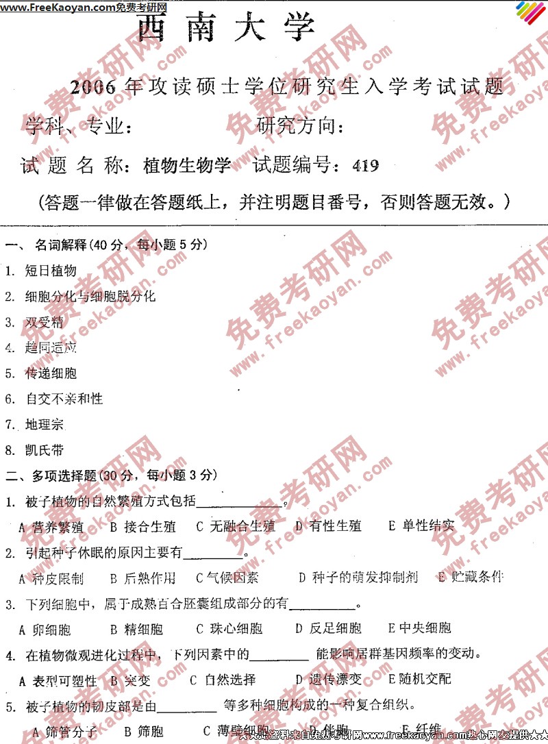专业课考研经验 本站小编 FreeKaoyan 2018-01-23西南大学2006年考研真题-园林植物学