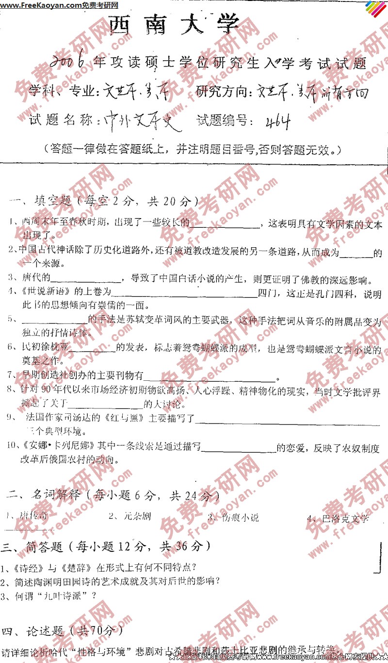 专业课考研经验 本站小编 FreeKaoyan 2018-01-23西南大学2006年考研真题-中国古代文学