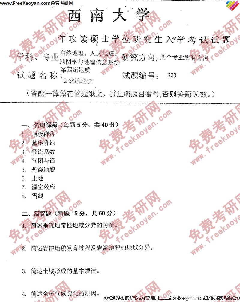 相关话题/西南大学 考研真题 自然地理学
