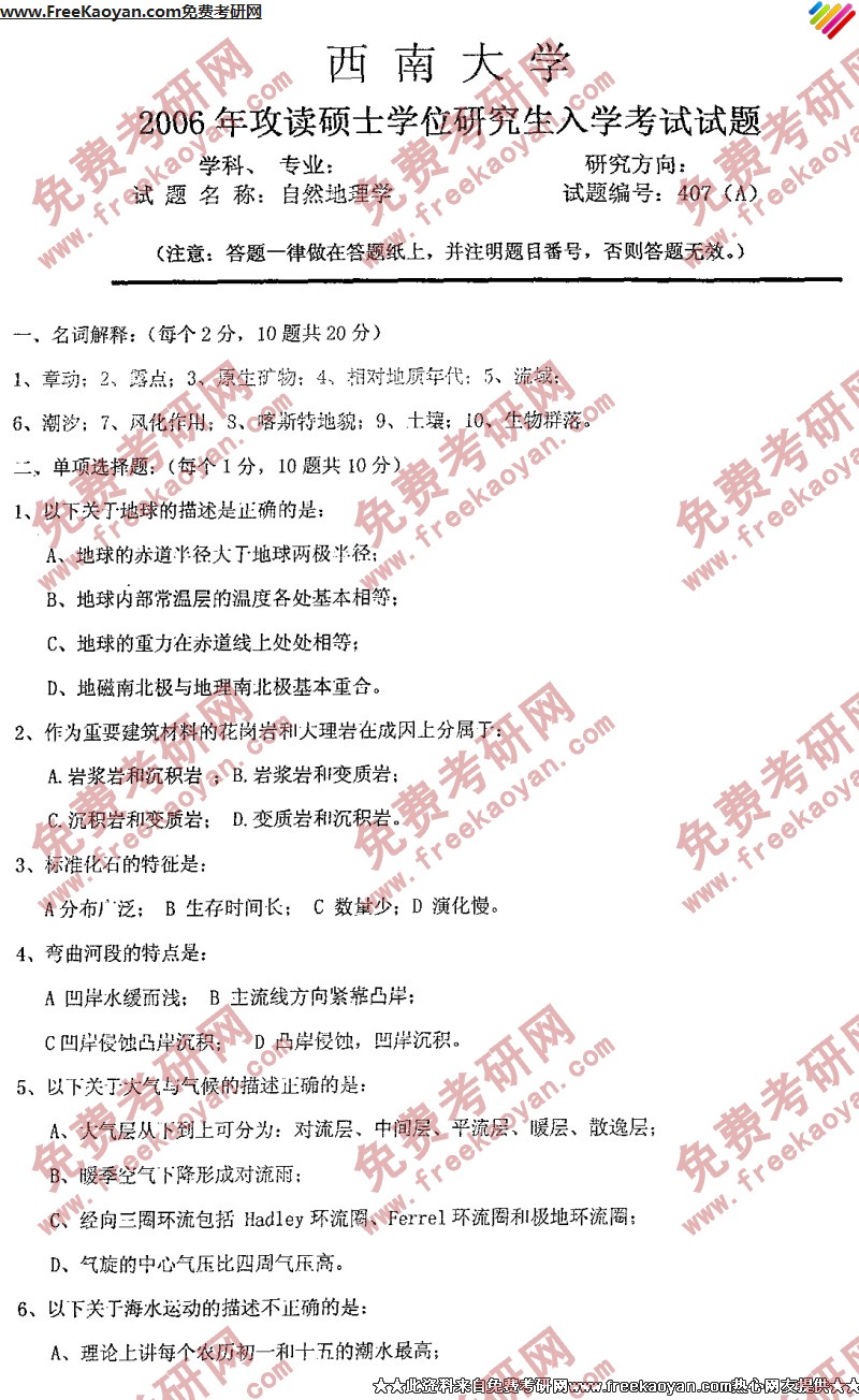 专业课考研经验 本站小编 FreeKaoyan 2018-01-23西南大学2006年考研真题-中国古代文学