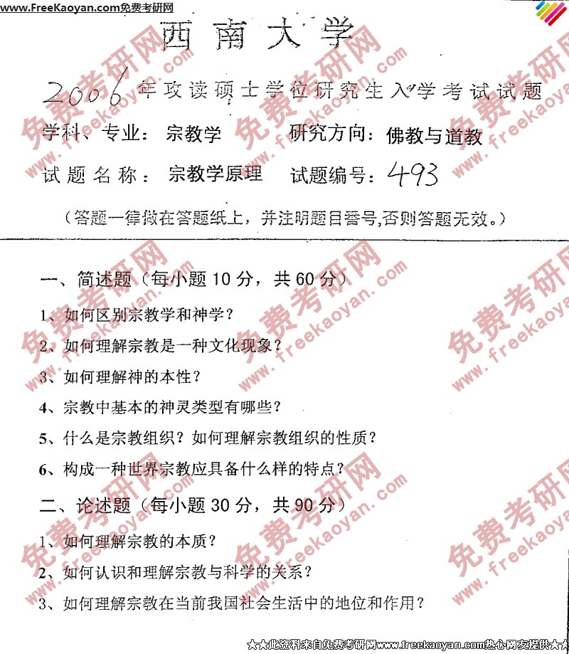 专业课考研经验 本站小编 FreeKaoyan 2018-01-23西南大学2006年考研真题-中国书法史论