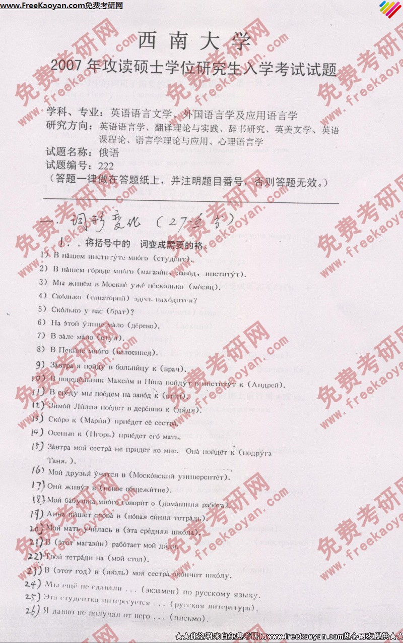西南大学2007年考研真题-俄语