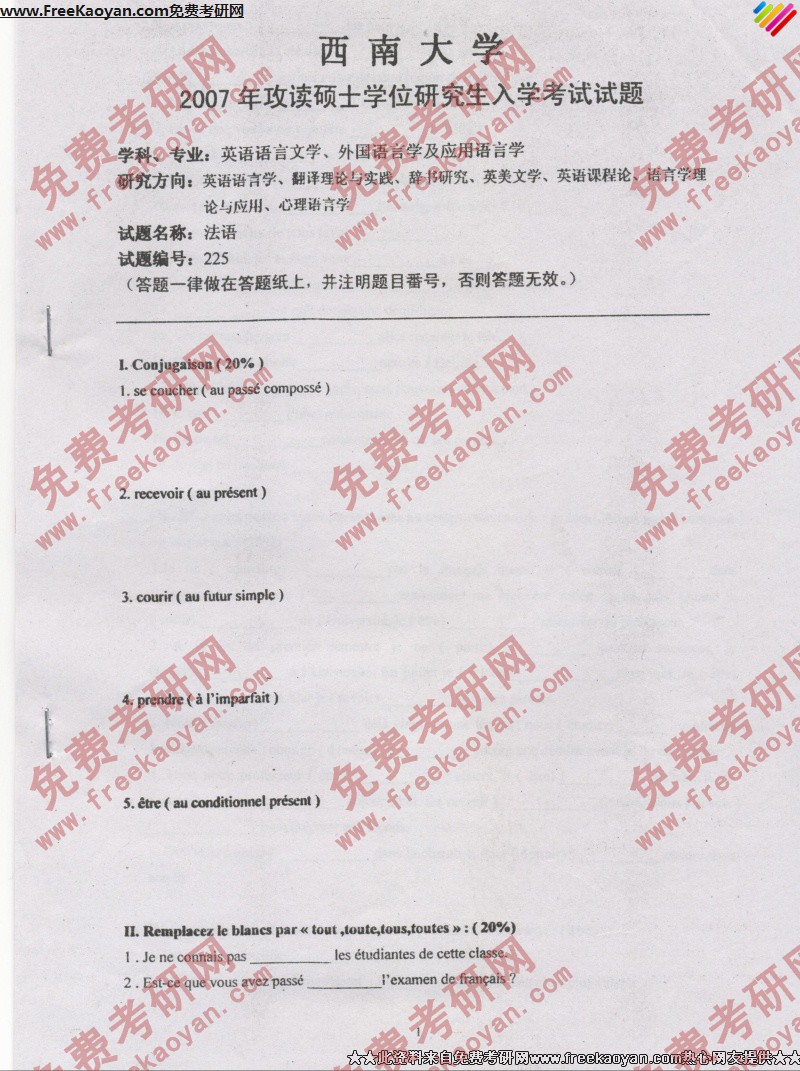 专业课考研经验 本站小编 FreeKaoyan 2018-01-23西南大学2007年考研真题-单考英语211-221