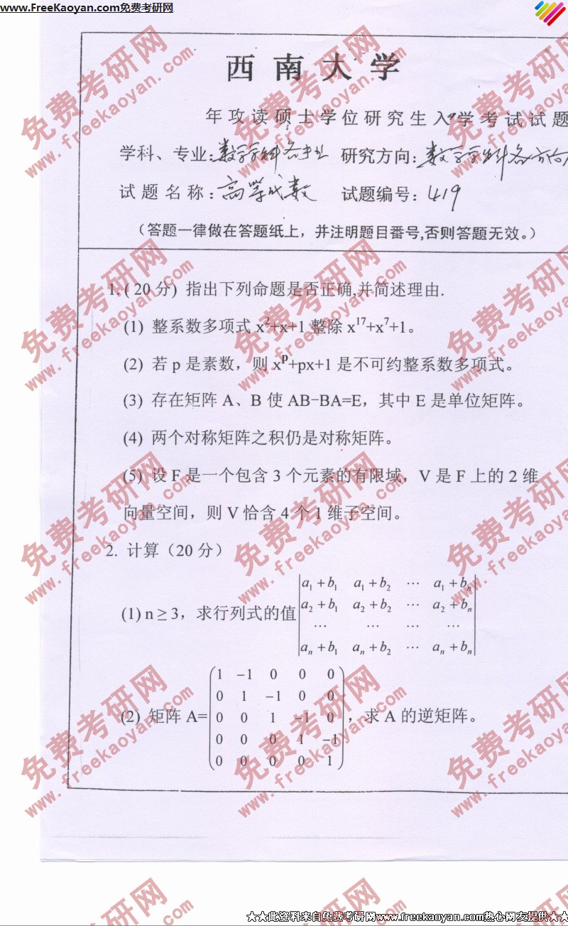 专业课考研经验 本站小编 FreeKaoyan 2018-01-23西南大学2007年考研真题-地质学