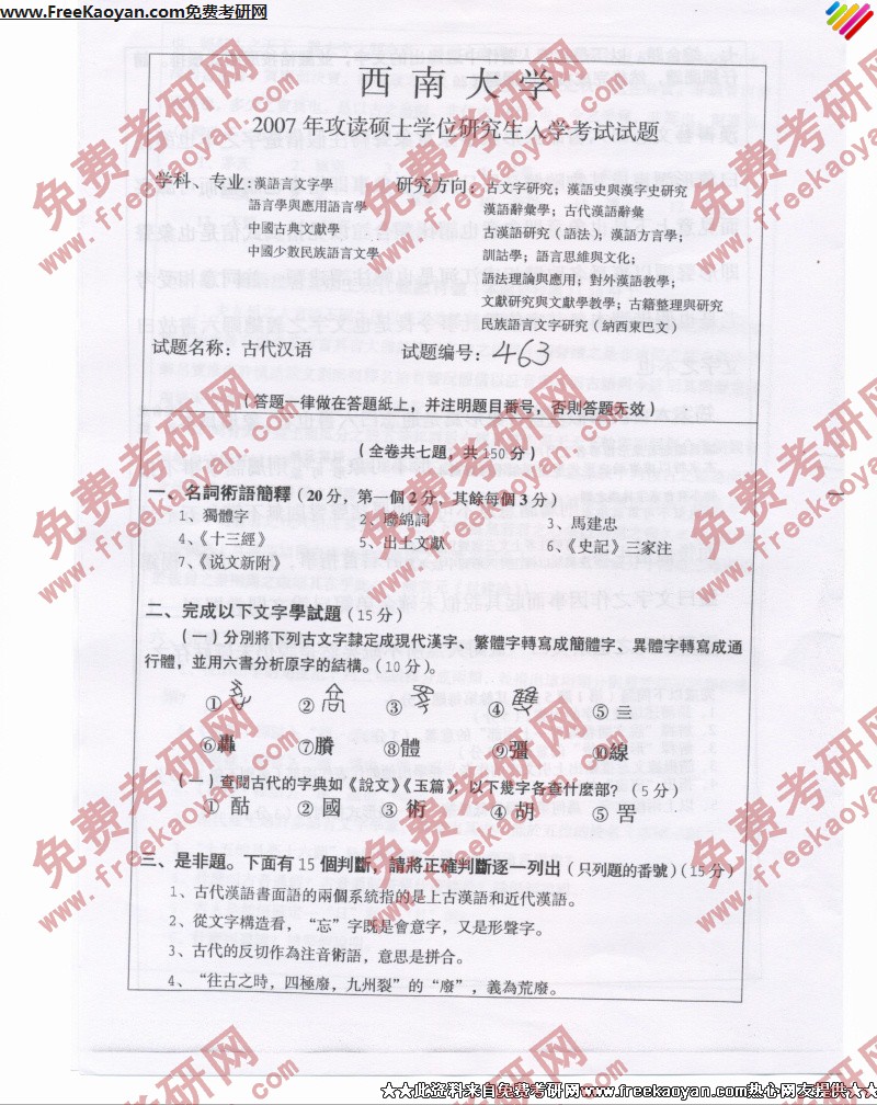 专业课考研经验 本站小编 FreeKaoyan 2018-01-23西南大学2007年考研真题-法语