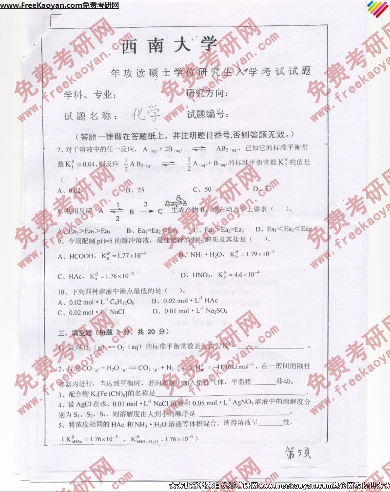 专业课考研经验 本站小编 FreeKaoyan 2018-01-23西南大学2007年考研真题-分析化学(环境类)