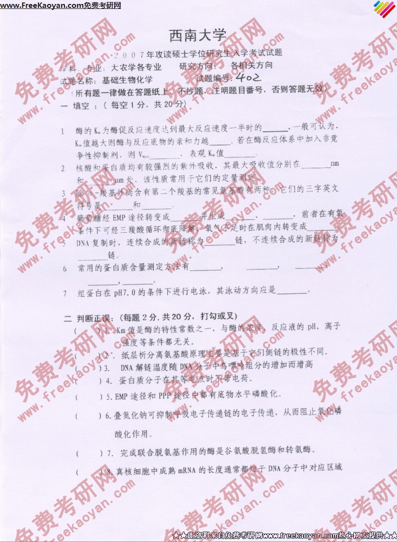 西南大学2007年考研真题-基础生物化学