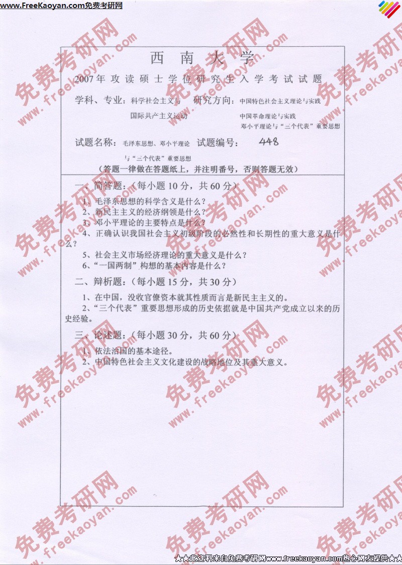 西南大学2007年考研真题-毛泽东思想邓小平理论三个代表重要思想