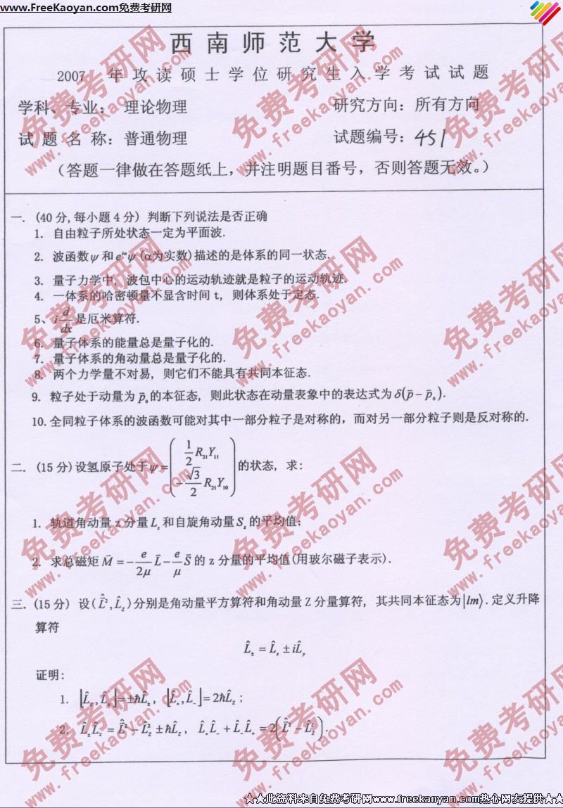 专业课考研经验 本站小编 FreeKaoyan 2018-01-23西南大学2007年考研真题-普通物理