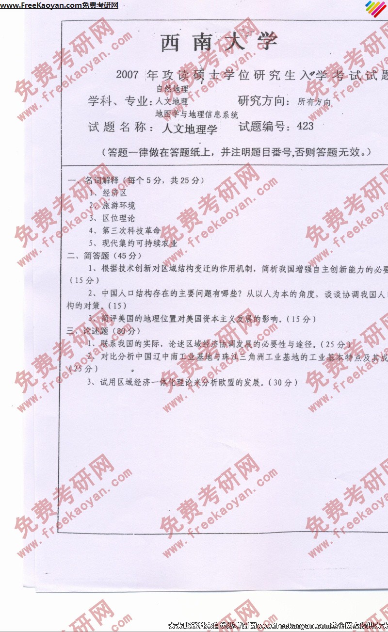 专业课考研经验 本站小编 FreeKaoyan 2018-01-23西南大学2007年考研真题-区域经济学