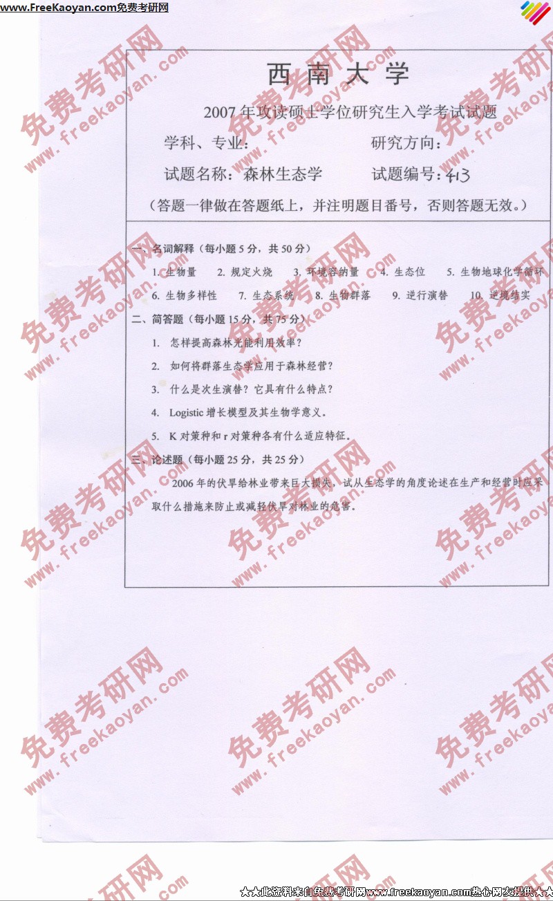 西南大学2007年考研真题-森林生态学