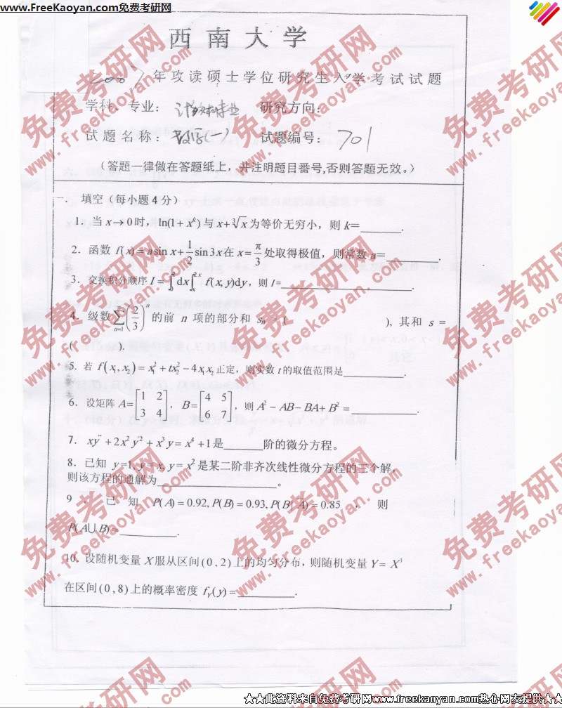 西南大学2007年考研真题-数学(一)